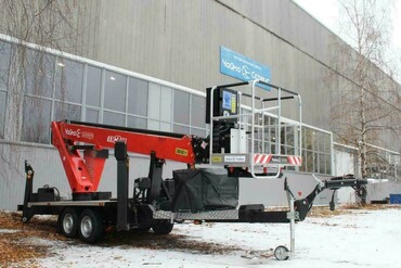 Телескопический гидравлический подъемник-мобилен.В сложенном положении его р-ры составляют:длина–7400 мм;ширина–2000 мм.А учитывая то, что в сложенном состоянии транспортировка осуществляется путем стыковки прицепного подъемника к автомобилю, работать с ним довольно удобно.Прицеп оснащён регулируемым дышлом, что позволяет эксплуатировать подъёмник в составе с любым шасси.